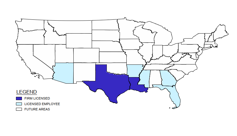 HY Engineering LLC is licensed and registered with the engineering boards of Texas and Louisiana to provide professional engineering and design services across the nation as shown.